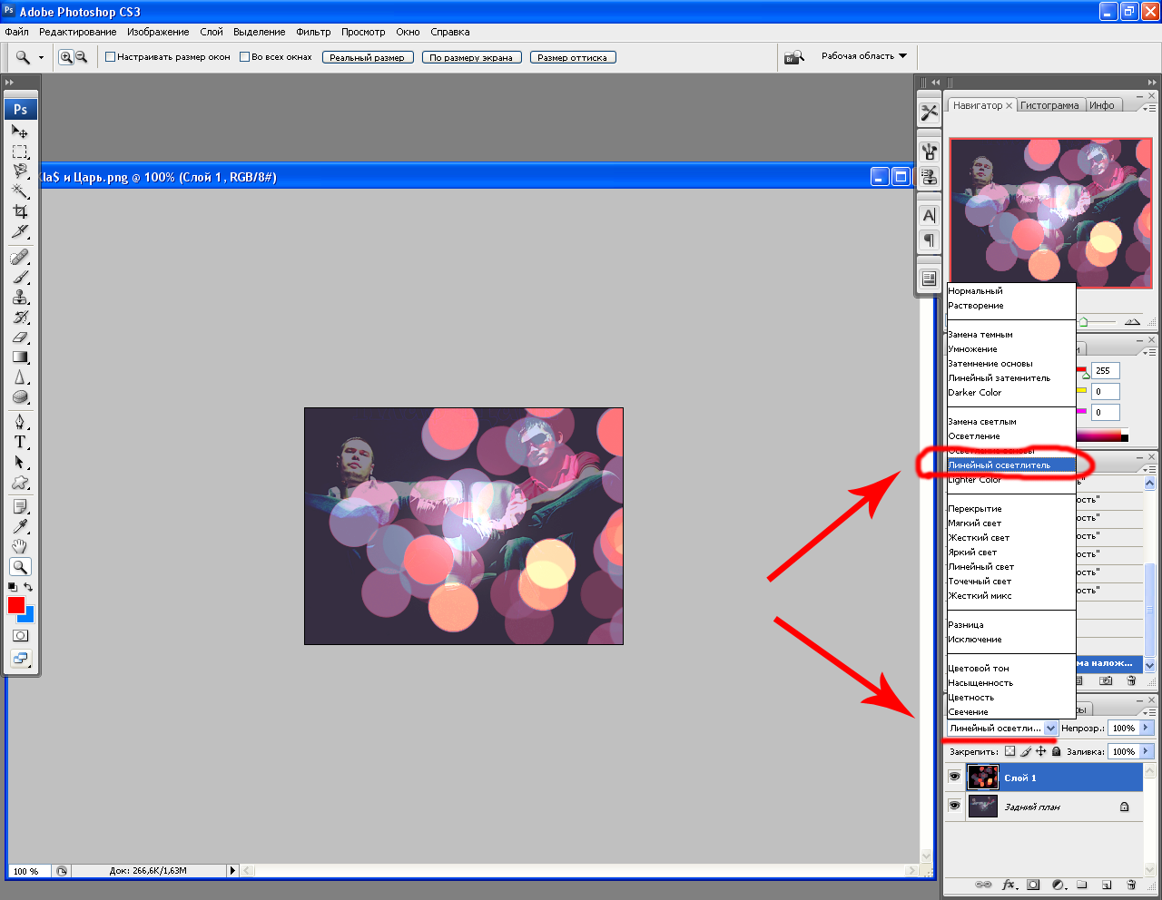 14. Выбераем параметр наложения текстуры - Линейный осветлитель. Мы видим что картинка стала прозрачной.