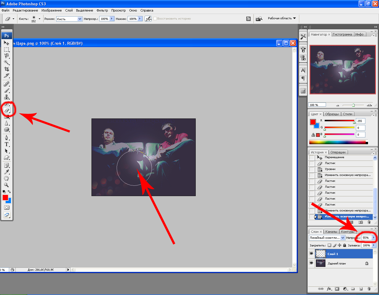 21. Берём ластик, диаметр подбираем как на скриншоте, стираем с говнодава ненужные нам кружочки. Непрозрачность ставим 55%.