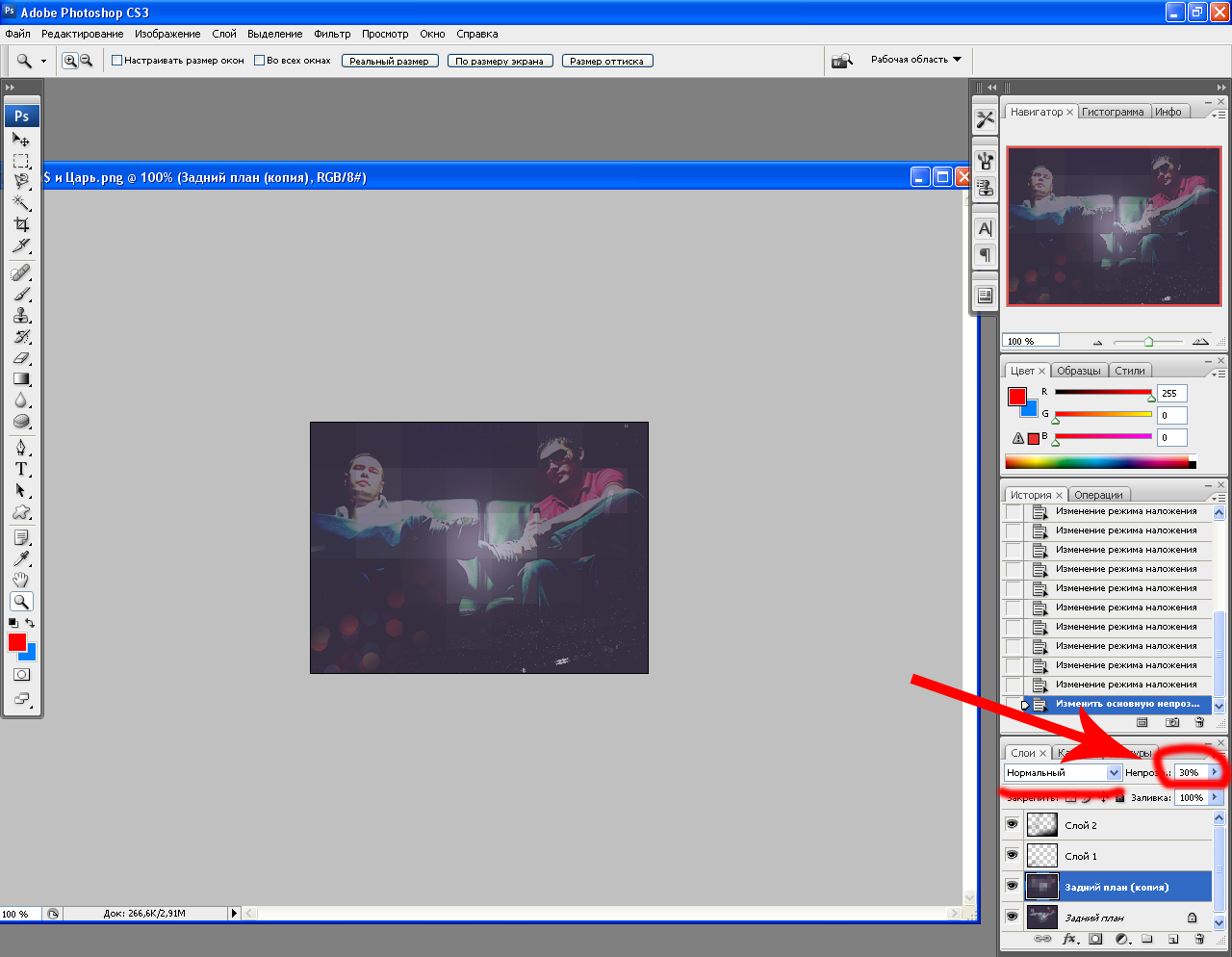 29. Оставляем режим наложения нормальный, но уменьшаем прозрачность слоя до 30%.