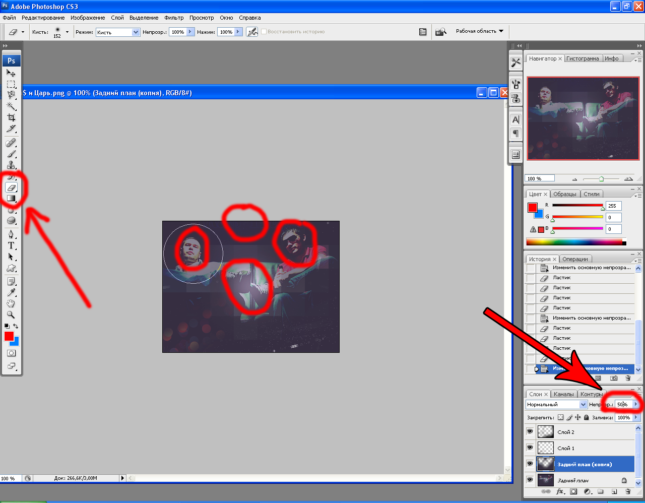 30. Позже выясняется что я злодей и врал вам про 30% непрозрачности, можете засрать меня в комментах. Ну да ладно, ставим прозрачность слоя 50%, тыкаем ластик, кисть мягкая, непрозрачность ластика 100%, диаметр как на скане. По одному разу, тыкаем на места, где обведены красные круги, дабы избавить работу от лишних текстур.