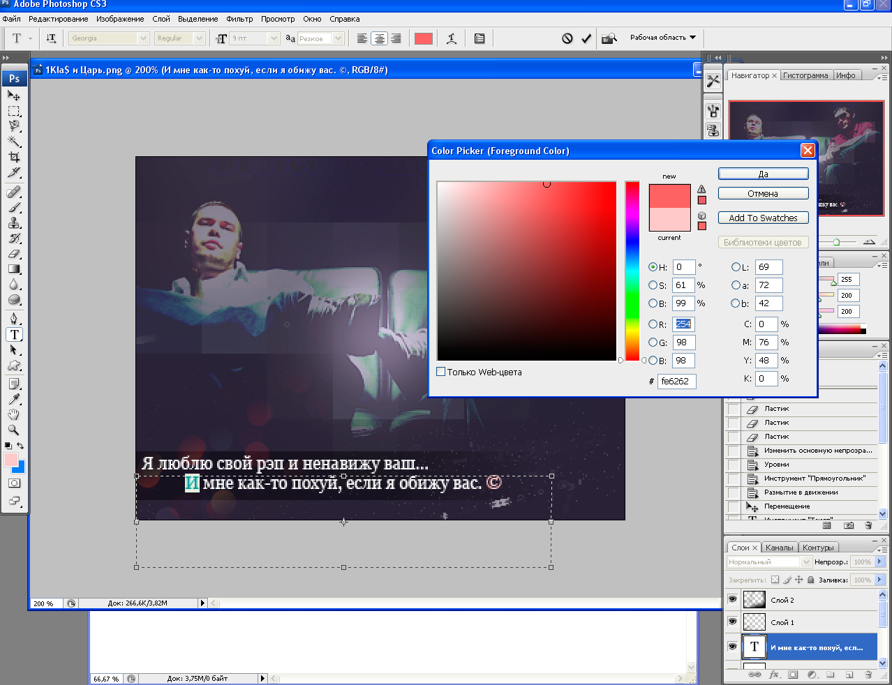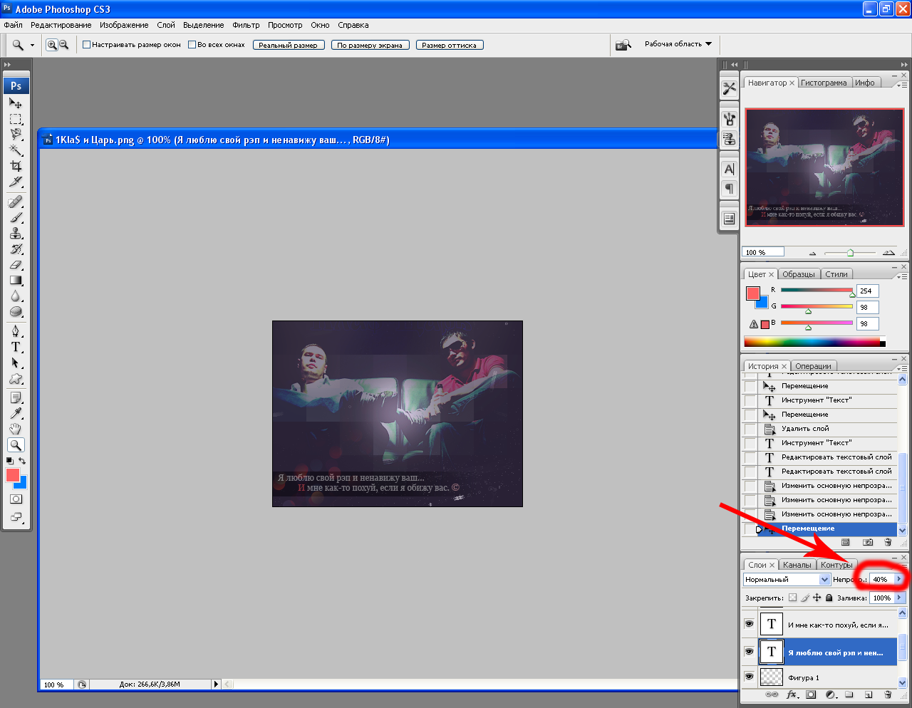 43. После этого, берём наш основной слой с текстом и делаем его прозрачность на 50%.
