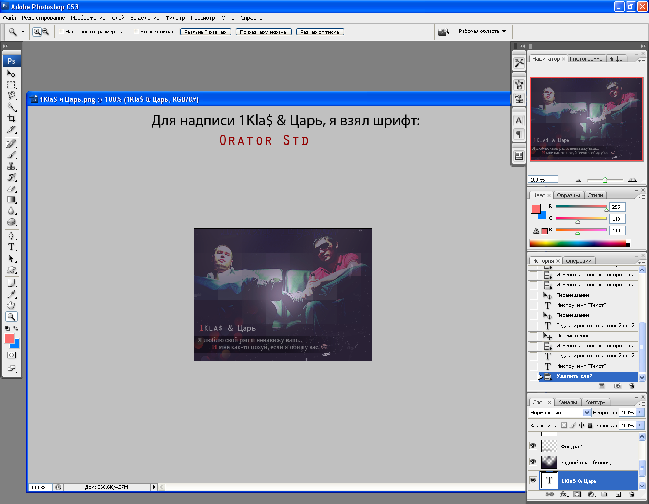 40. Чуть выше, пишем надпись - "1Kla$ & Царь", но уже другим шрифтом, название шрифта указанно на скане. Цифру 1 перед Kla$, выделяем красноватым цветом.