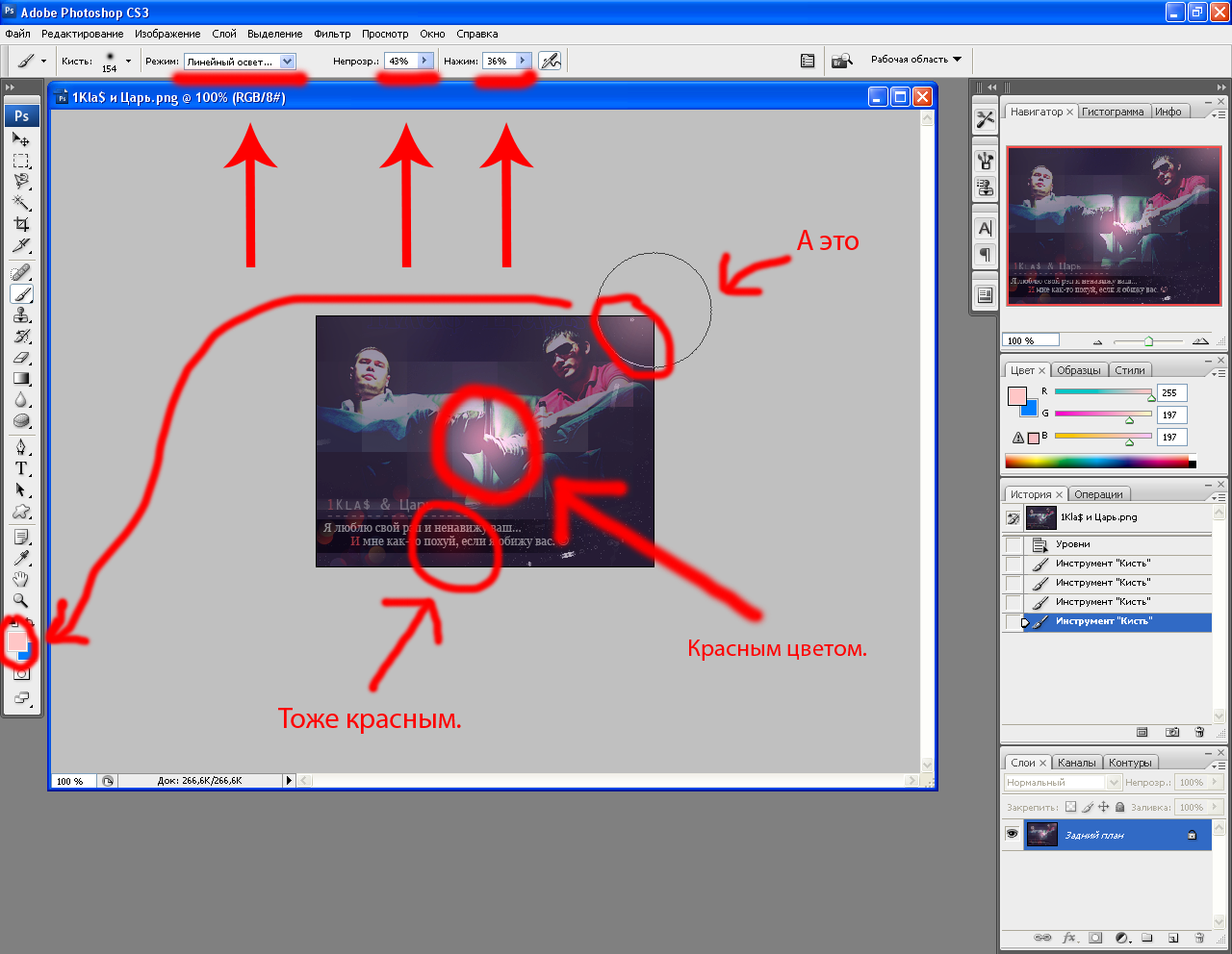 48. Ставим непрозрачность и нажим как на рисунке, подстраиваем диаметр кисти тоже как на скане и там где я обвёл красными кружками, по одному клику делаем лёгкое освещение. Ярко-красным цветом, делаем освещение на говнодавах и на буквах, а в правом, верхнем углу, делаем освещение бледно красным. Диаметр не меняем.